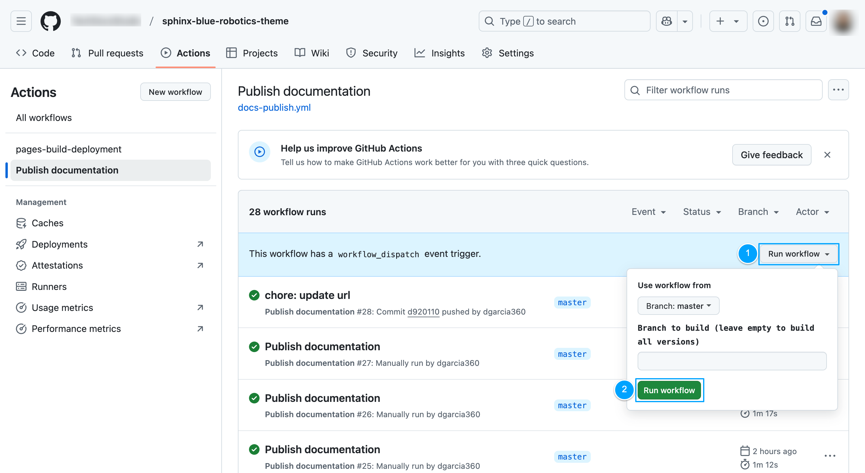 If you push to the default branch docs folder, the workflow will automatically build and deploy the default branch version of the documentation.